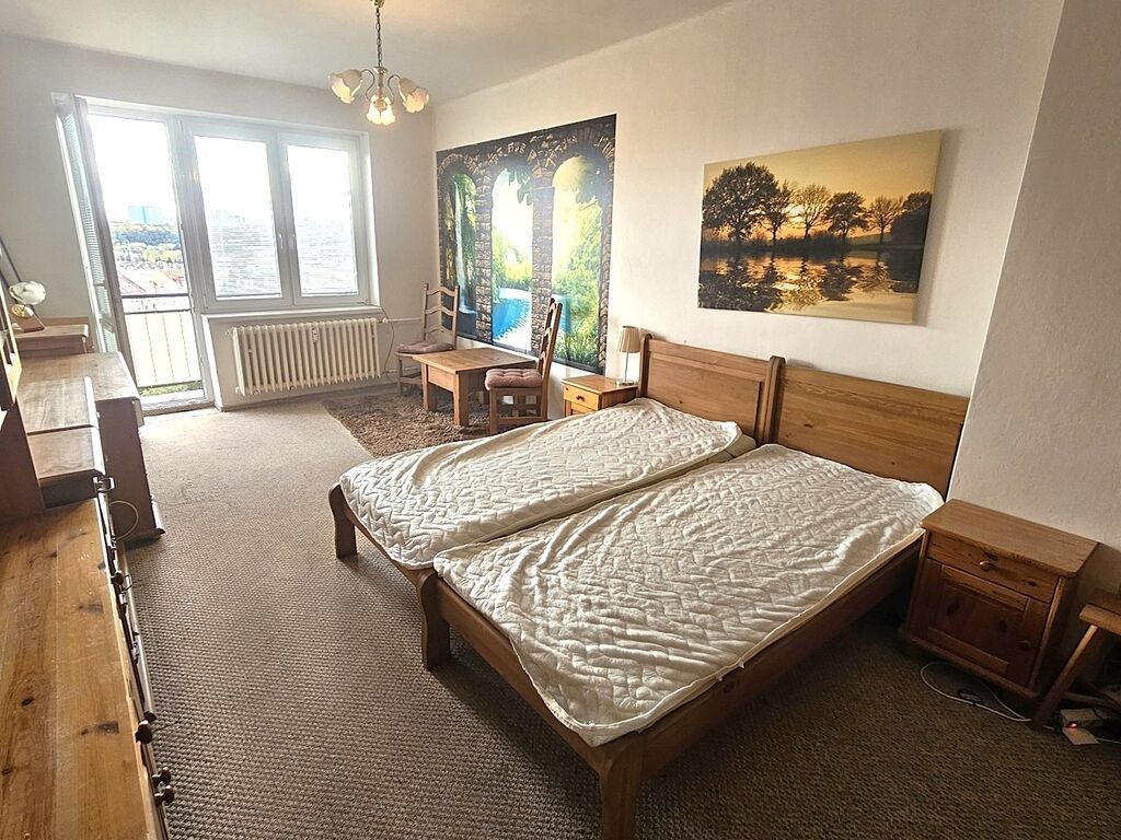 Byt sestává ze vstupní chodby, 2 samostatných pokojů (22 m2 a 14 m2), které mohou být vzájemně navíc průchozí, kuchyně, koupelny, WC a balkónu. Byt se nabízí kompletně zařízený kvalitním holandským nábytkem z masivu viz foto. Kuchyně je vybavena plynovým sporákem, lednici s mrazákem, nádobím a kuchyňské vybavením včetně el. odšťavňovače a rychlovarné konvice a vestavěnou pračkou. V koupelně je sprchový kout a umývadlo. Dále samostatné WC a vstupní chodba s vestavěnou šatní skříní a věšákovou stěnou se zrcadlem. Na podlaze je v obou pokojích koberec, v chodbě plovoucí podlaha, jinak dlažba. Okna jsou plastová se žaluziemi.