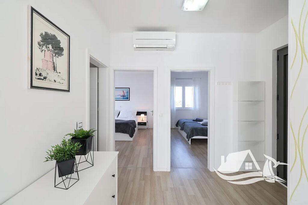 Dům s obytnou plochou 235 m² je postaven na pozemku o velikosti 821 m² a skládá se ze čtyř samostatných, plně vybavených apartmánů – dvou v přízemí a dvou v prvním patře. Každý z nich má vlastní vstup, klimatizaci a kompletní vybavení, takže dům je připraven k okamžitému provozu nebo k pohodlnému vícegeneračnímu bydlení.
