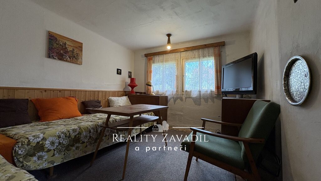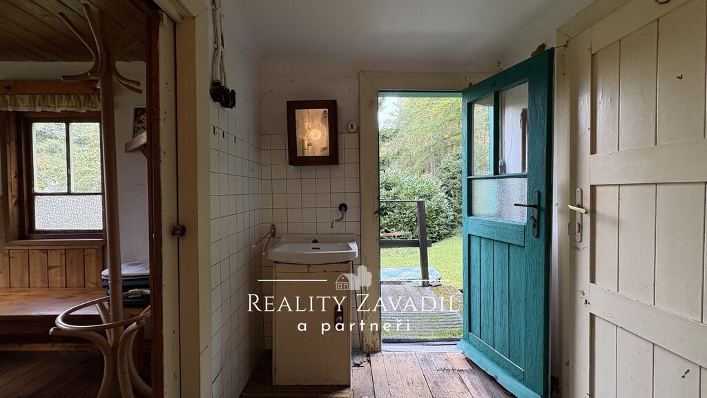 Částečně zařízená chata disponuje koupelnou a toaletou s odděleným přístupem mimo obytnou část.