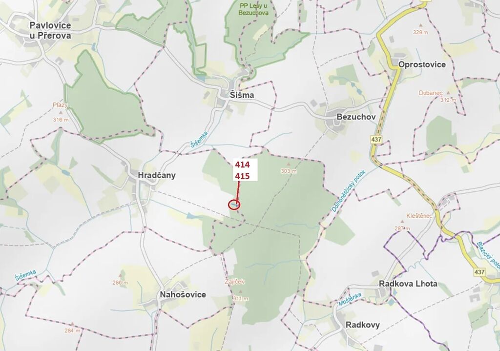 Lesní pozemek o výměře 975 m2, parcelní čísla 414, 415, podíl 1/1, katastrální území Hradčany na Moravě, obec Hradčany, obec s rozšířenou působností Přerov, okres Přerov, Olomoucký kraj. Po těžbě.