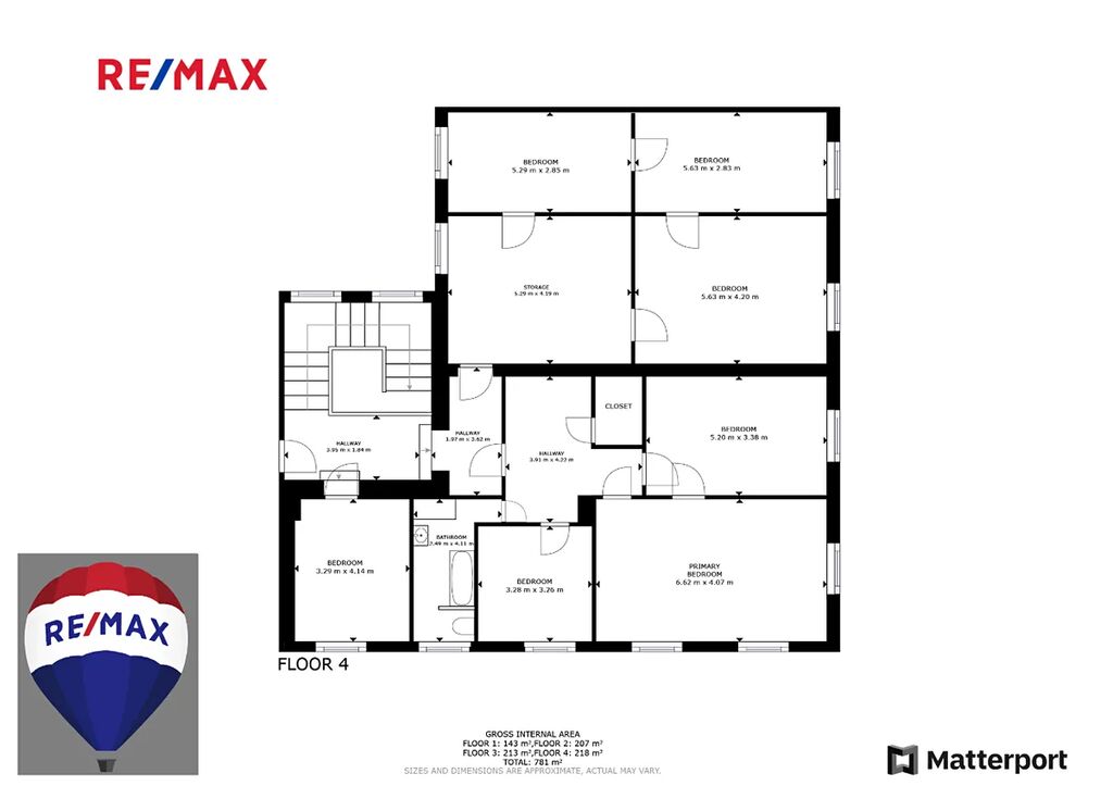 Celková užitná plocha nemovitosti cca 800 m², jedno podzemní a tři nadzemní patra.