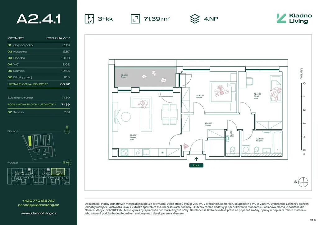 Nabízíme ke koupi moderní byt 3+kk o podlahové ploše 71,4 m² s terasou 7,3 m² v rezidenčním projektu Kladno Living, který vzniká v jedné z nejatraktivnějších lokalit města Kladno – Kročehlavy. Tento nový developerský projekt představuje jedinečnou příležitost pro ty, kteří hledají nové byty v Kladně nebo investici do nemovitosti s vysokým potenciálem zhodnocení.