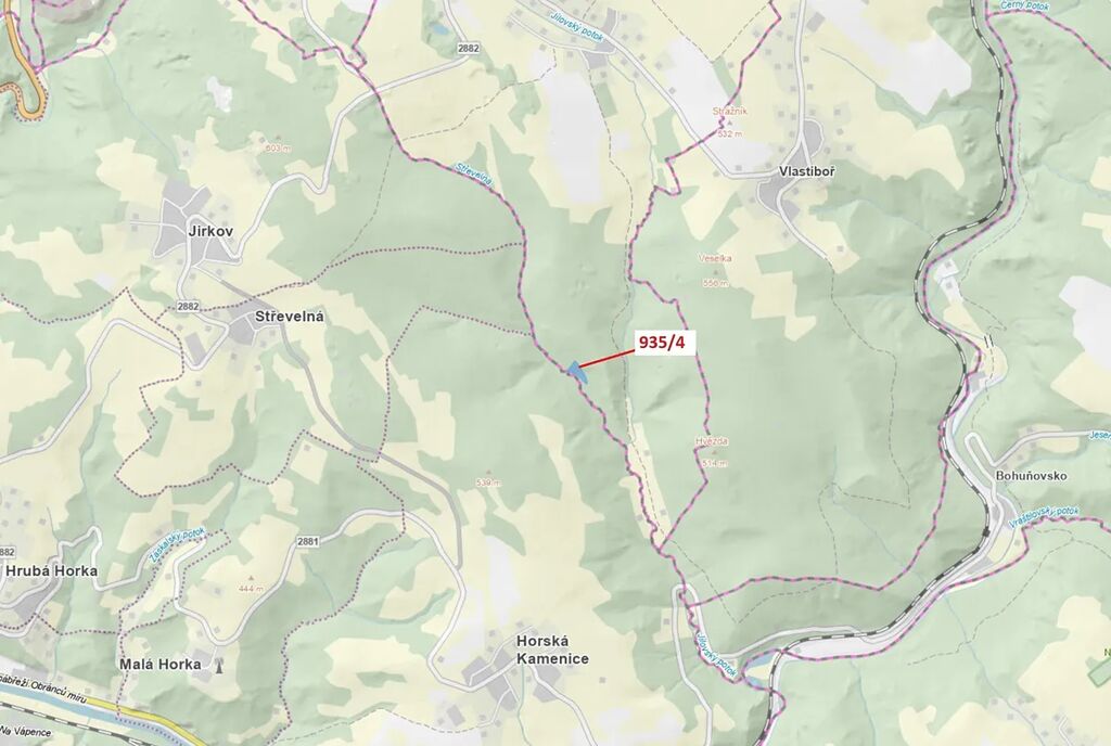 Lesní pozemek o výměře 3 532 m2, parcelní číslo 935/4, podíl 1/1, katastrální území Jílové u Držkova, obec Jílové u Držkova, obec s rozšířenou působností Železný Brod, okres Jablonec nad Nisou, Liberecký kraj. Po těžbě.
