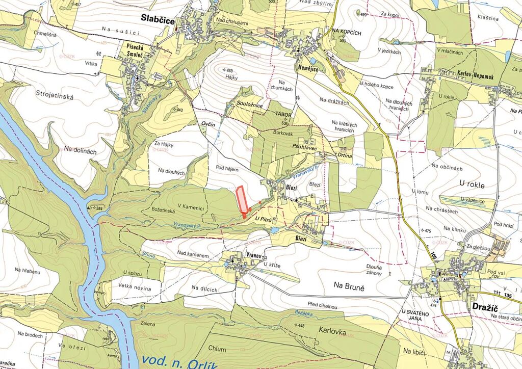 Pozemky jsou zapsány na LV 55. Jedná se o půdu na 4 parcelách, jejichž a celková výměra je 22 762 m². Majitel zde pa prodává 17 072 m².