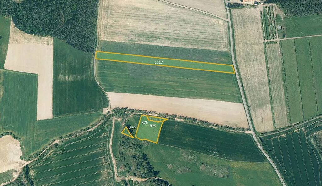 Pozemky jsou zapsány na LV 276 pod parcelními čísly 859, 875, 876 a 1117. Jejich celková rozloha je 18 718 m2. Z toho orná půda je 11 930 m2, trvalý travní porost 5 522 m2, lesní pozemek 494 m2 a ostatní plocha 772 m2.