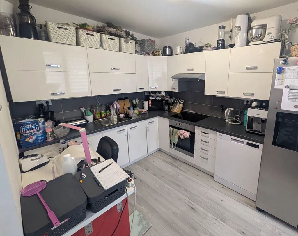 V kuchyni je kuchyňská linka v bílém lesku s vestavěnými spotřebiči a varnou deskou. V koupelně je vana, sprchový kout a WC. Celý interiér je laděný do bílých a šedých odstínů stejně jako plovoucí podlahy a dveře. Koupelna je obložena moderními obklady ve stejných barvách. K bytu náleží kumbál i sklep.