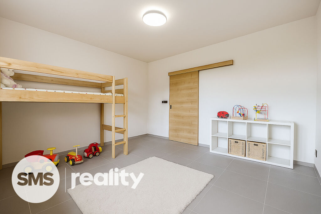 Uvnitř vás přivítá útulný obývací pokoj s velkými balkonovými dveřmi, které zajišťují dostatek denního světla. Z obývacího pokoje vede vstup do pracovny nebo dalšího pokoje, který lze využít jako domácí kancelář či dětskou hernu. Moderní kuchyně v černé barvě se světlými dřevěnými prvky je částečně podsvícená LED páskem. Kuchyně je vybavena indukční varnou deskou, elektrickou troubou, myčkou nádobí, lednicí s mrazákem, digestoří a granitovým dřezem. Koupelna je obložena velkoformátovou šedou dlažbou a disponuje vanou, vodovodní baterií se sprchovou hlavicí, topným žebříkem, koupelnovou skříňkou a toaletou s vestavěným geberitem. Moderní osvětlení, designové prvky a kvalitní materiály podtrhují pohodlí a luxusní atmosféru celého domu.