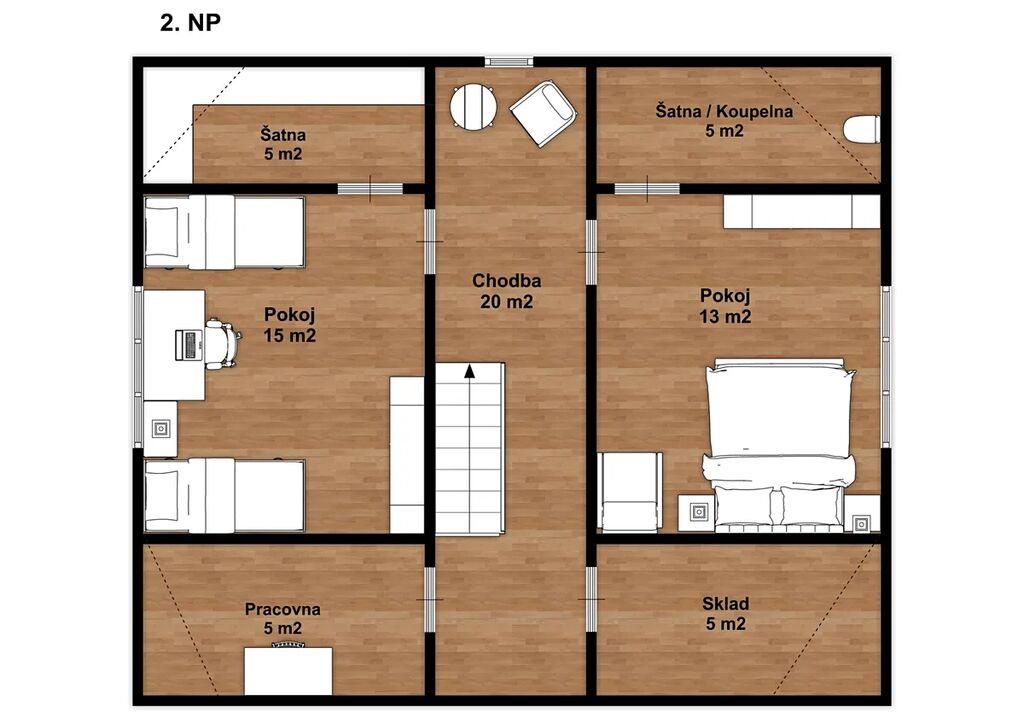 Po vyvedení vody a odpadu do patra lze snadno vybudovat samostatnou bytovou jednotku – ideální pro pronájem nebo jako apartmán.
