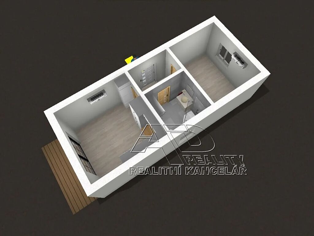 Dispozice: předsíň [3.1m2], obytná kuchyně [12m2] s přístupem na terasu, ložnice / pokoj [9.2m2] a koupelna/WC [3.8m2]. Orientace obýváku / terasy na jih do zahrady, ložnice na sever.