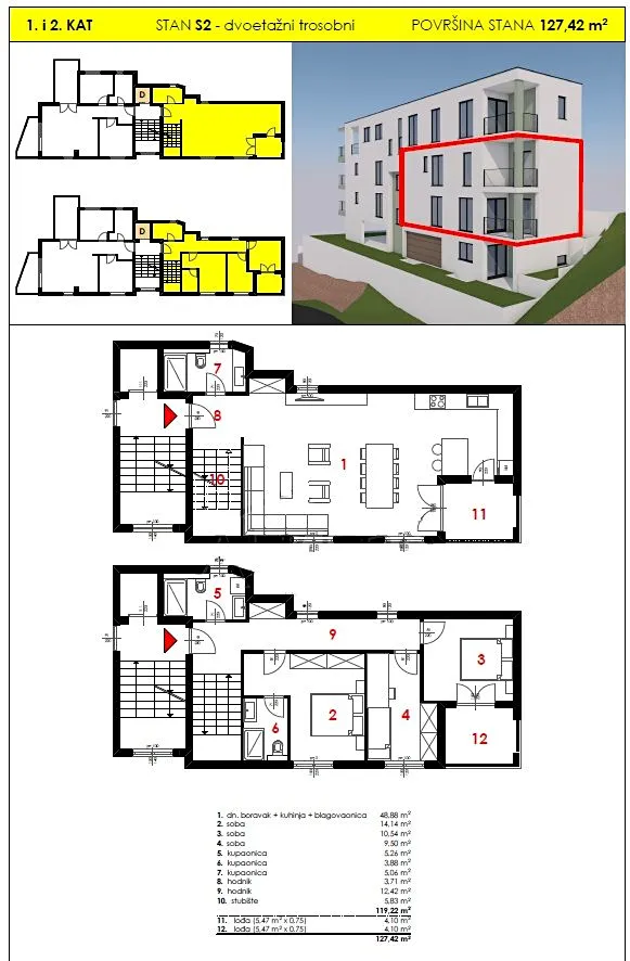 Apartmán S2 o celkové ploše 127,42 m2 je umístěný v 1. a 2. patře budovy, která se skládá ze suterénu s úložnými prostory, přízemí s krytými a venkovními parkovacími místy a 3 dalšími patry. Apartmán sestává z chodby, schodiště, tří ložnic, tří koupelen, dvou lodžií orientovaných na sever o celkové rozloze 10,94 m2 s krásnými výhledy na pohoří Biokovo a obývacího pokoje a kuchyně s jídelnou. Při stavbě a interiérovém vybavení apartmánů jsou použitý pouze materiály nejvyšší kvality. Špičková tepelná a zvuková izolace, elektrické rolety, bezpečnostní vstupní dveře, klimatizace, koupelny vybavené podlahovým vytápěním a keramikou 1.třídy, kvalitní parkety a keramická dlažba. K apartmánu lze dokoupit krycí parkovací stání za 15 000 € nebo venkovní parkovací stání za 10 000 €.