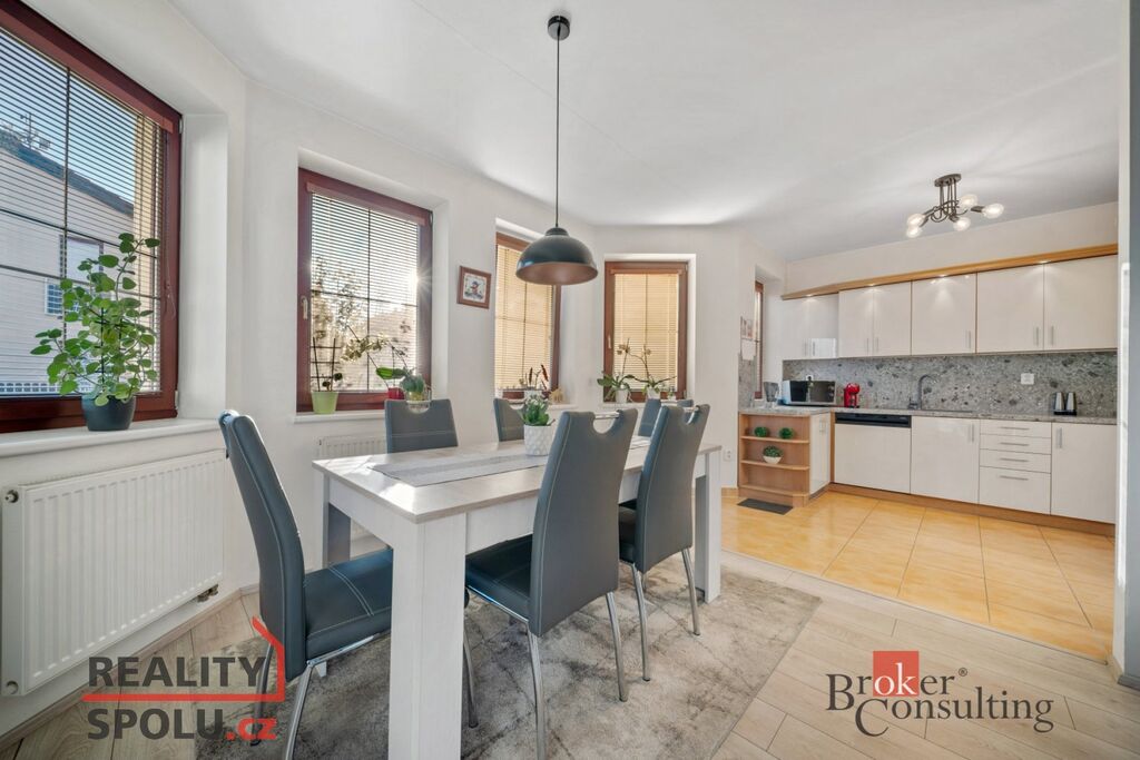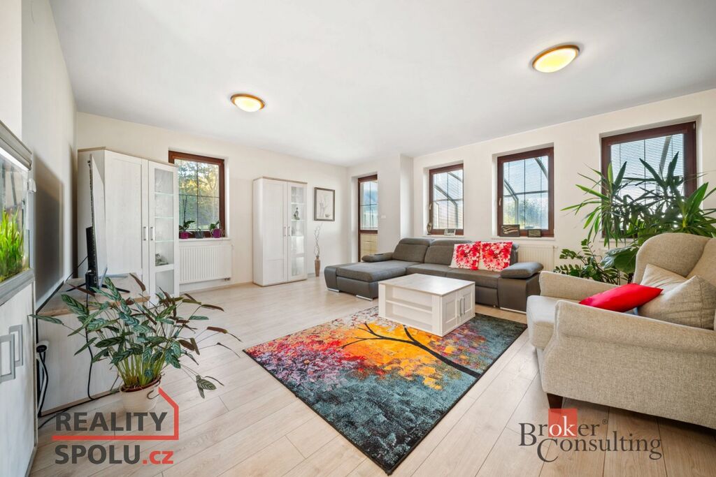 prostorný obývací pokoj propojený s kuchyní a jídelnou – tvořící příjemnou společenskou zónu