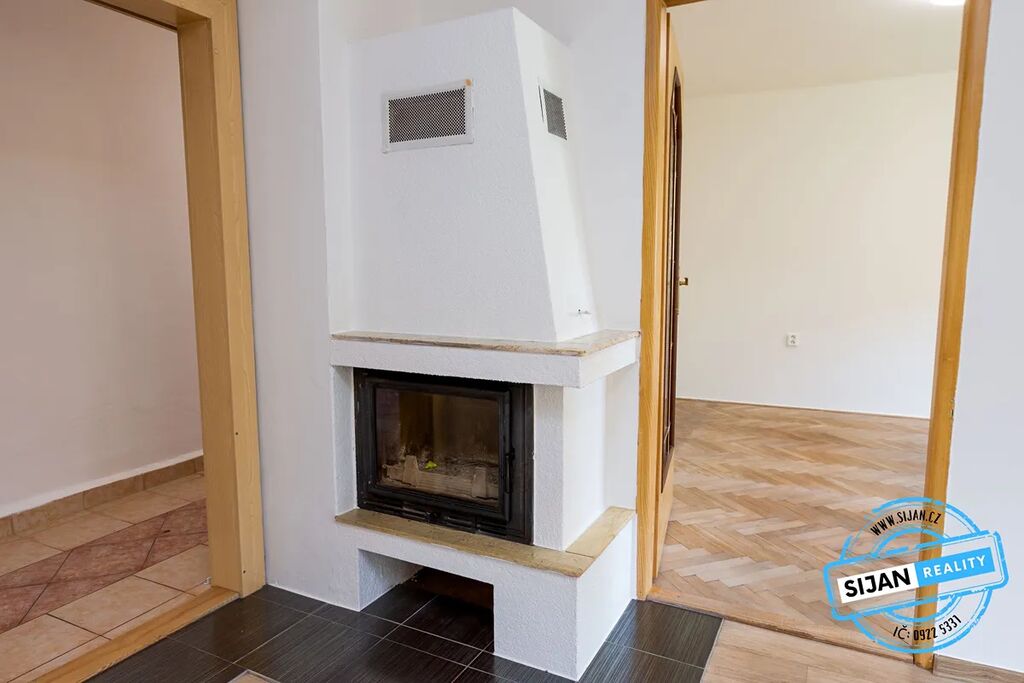 obývací pokoj s krbem, ložnice, kuchyně (bez kuchyňské linky), samostatné WC, koupelna (rohová vana) a předsíň.