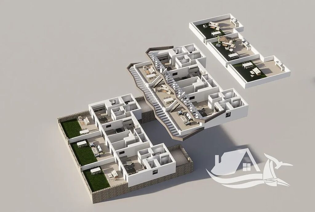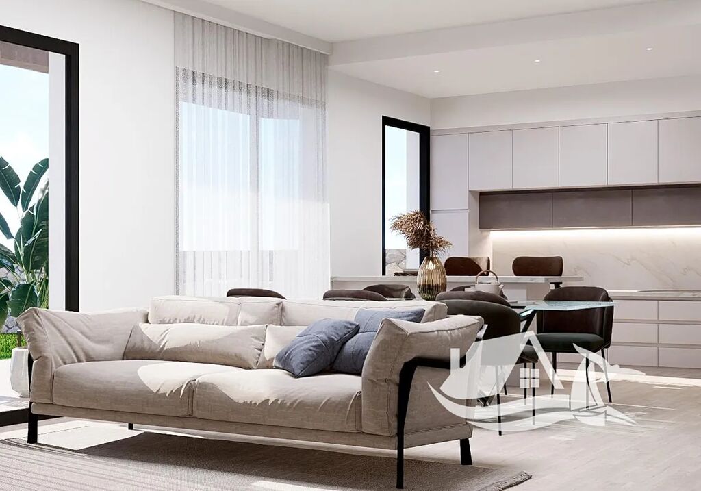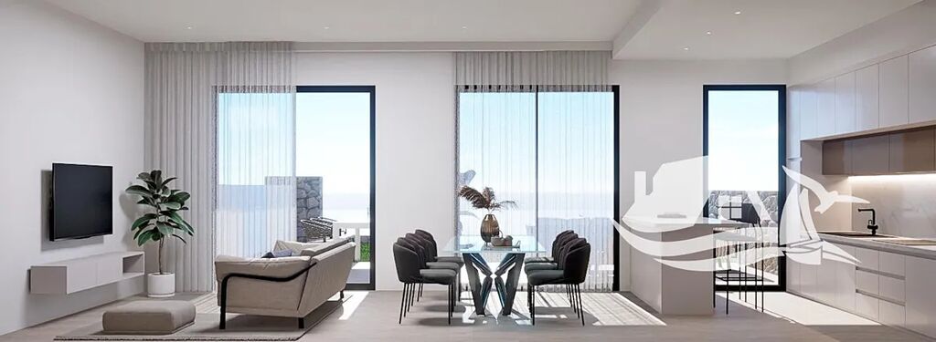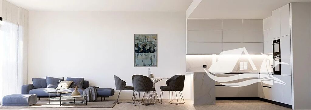 Prostorný apartmán o dispozici 4+kk a celkové ploše 96 m² doplňuje terasa o velikosti 131 m², ze které se otevírá výhled na moře. K bytu patří dvě koupelny, soukromé parkovací místo a možnost využívat společný bazén obklopený upravenou zahradou. Díky proskleným plochám je interiér plný světla a propojuje se s venkovním prostorem, který zve k relaxaci i posezení s přáteli.