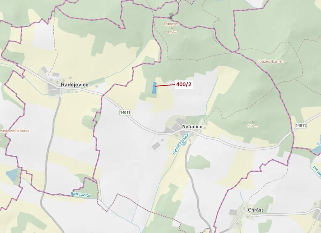 Lesní pozemek o výměře 3874 m2, parcelní číslo 400/2, podíl 1/1, katastrální území Netonice, obec Bílsko, obec s rozšířenou působností Vodňany, okres Strakonice, Jihočeský kraj. Po těžbě.