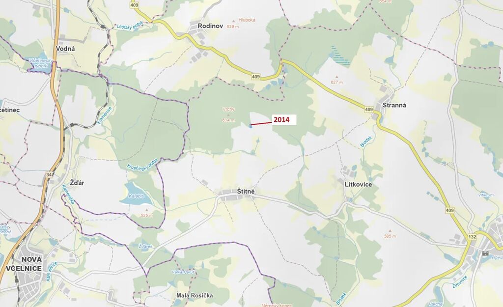 Lesní pozemek o výměře 2931 m2, parcelní číslo 2014, podíl 1/1, katastrální území Štítné, obec Žirovnice, obec s rozšířenou působností Pelhřimov, okres Pelhřimov, Kraj Vysočina. Částečně po těžbě.
