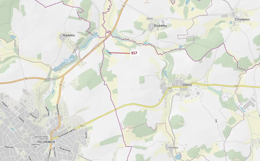 Lesní pozemek o výměře 2967 m2, parcelní číslo 317, podíl 1/1, katastrální území Olešná u Pelhřimova, obec Olešná, obec s rozšířenou působností Pelhřimov, okres Pelhřimov, Kraj Vysočina. Po těžbě.