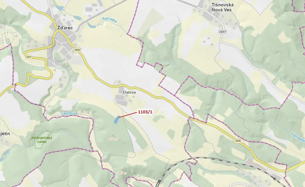 Lesní pozemek o výměře 3474 m2, parcelní číslo 1103/1, podíl 1/1, katastrální území Žďárec, obec Žďárec, obec s rozšířenou působností Tišnov, okres Brno-venkov, Jihomoravský kraj.