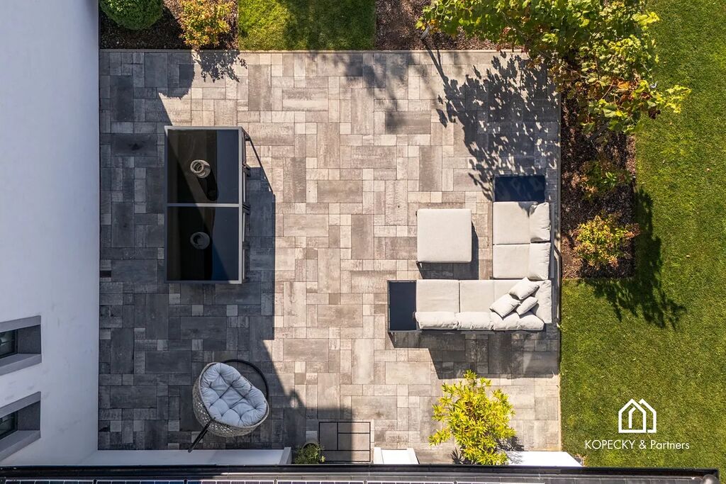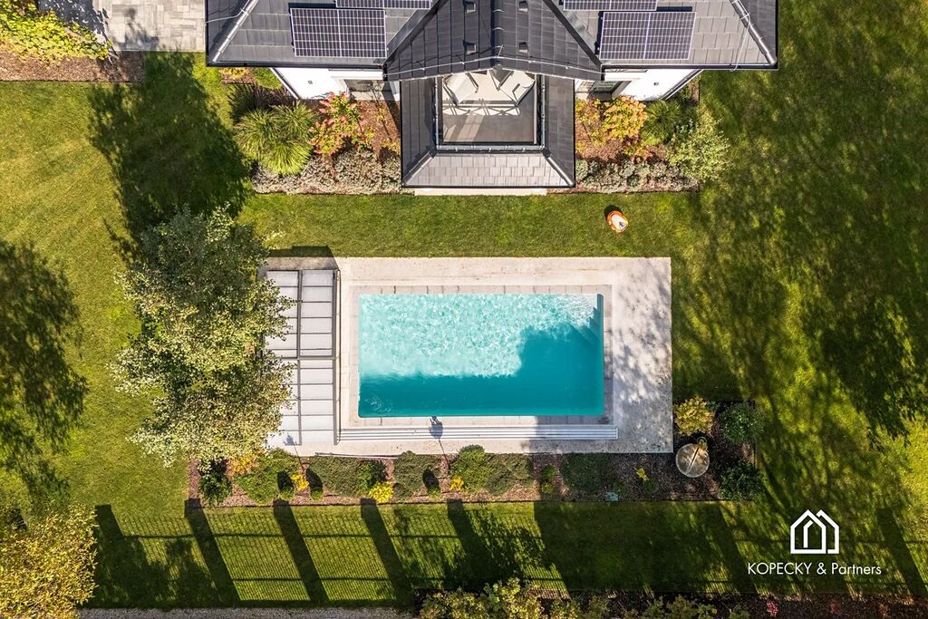 Na profesionálně udržované zahradě najdete zastřešený bazén 8×4 m se slanou vodou, zavlažovací systém, vrtanou studnu a zahradní domek. Parkování je zajištěno v dvojgaráži a na dalších plochách až pro 7 automobilů, včetně přípravy na dobíjení elektromobilů.