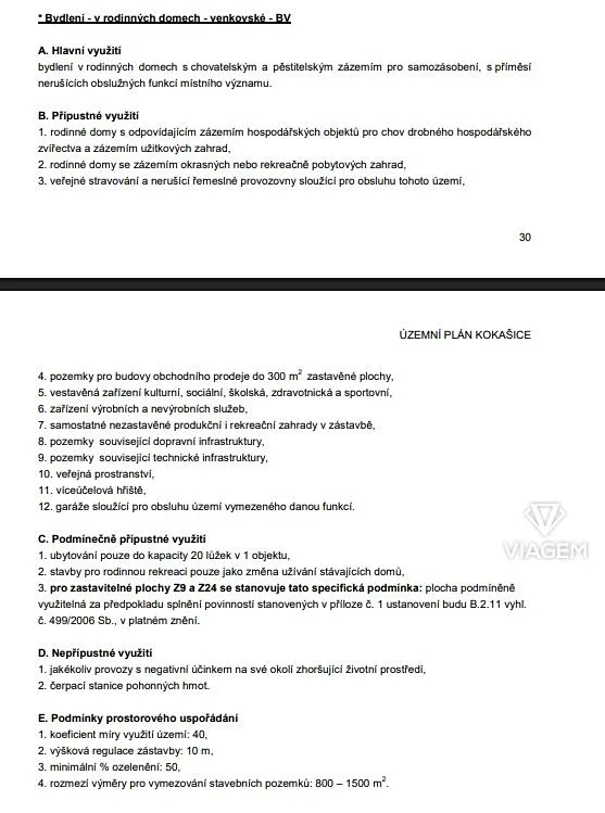 Pozemky jsou zastavitelný s možností připojení na inženýrské sítě. Na pozemcích lze postavit rodinný dům či rekreační objekt. Výšková regulace je zde nastavena na 10 m výšky, kdy koeficient zastavění představuje 50% plochy pozemku (více v přiložené fotodokumentaci).