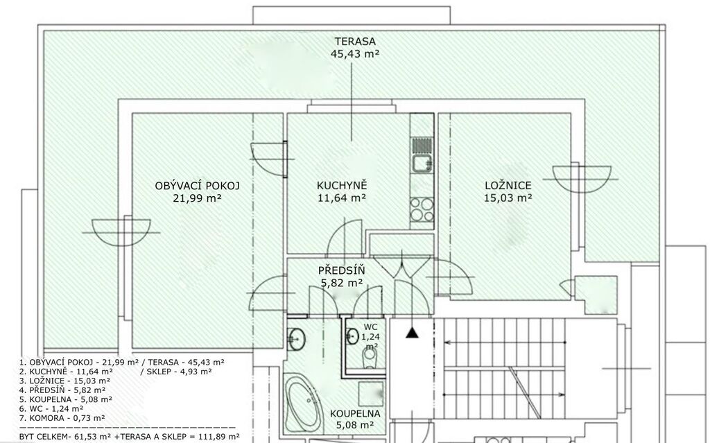 - plocha bytu 61,53 m2 + terasa 45,43 m2 + sklep 4,93 m2 = celkem 111,89 m2