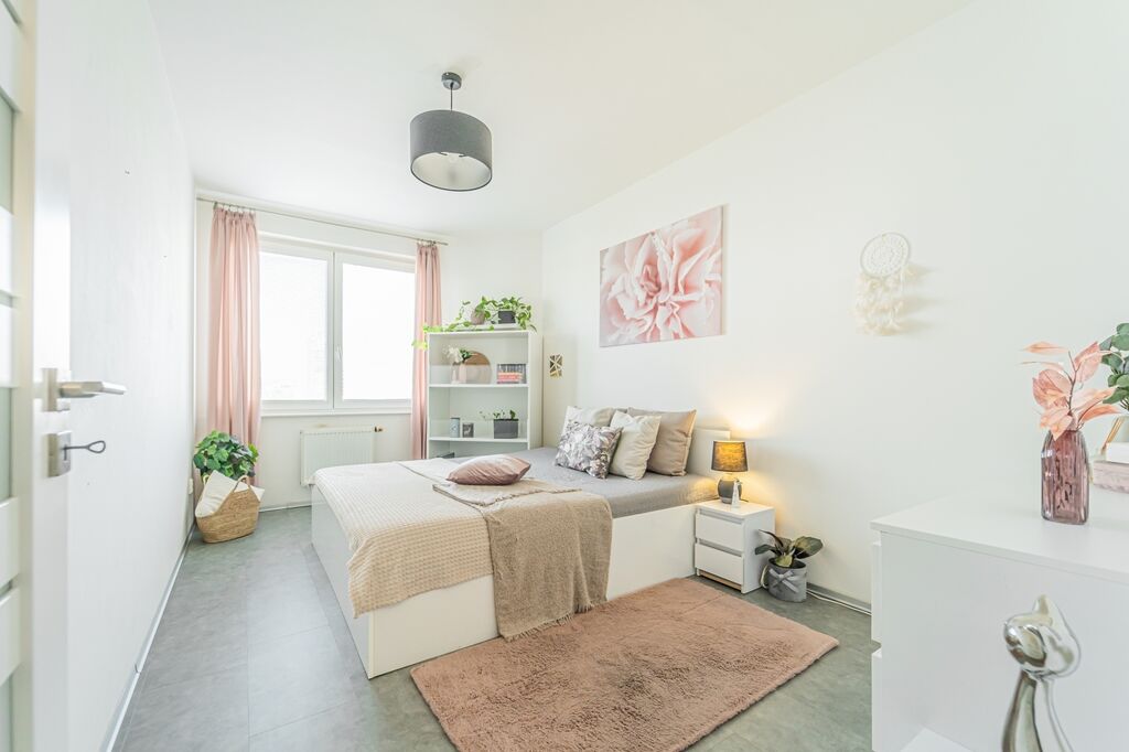 Srdcem bytu je krásný, prostorný a světlý obývací pokoj, propojený s novou kuchyní, kde je dostatek místa i pro jídelní stůl. Dvě ložnice budou určitě velmi dobře sloužit mladším členům rodiny. Ze všech zmiňovaných místností je vstup na hezkou, zasklenou lodžii. Ta může díky své výměře převážnou část roku sloužit jako další obytná místnost. Velkým bonusem je ještě jedna ložnice s vlastní toaletou a koupelnou, kde mohou například rodiče mít maximální klid a soukromí. Pro další členy rodiny je k dispozici hlavní koupelna s WC a bidetem. Velkou výhodou je dostatečně velká hala, kde máte dost místa na velkou šatní skříň. Dalším praktickým doplňkem je i komora na všechny věci, které chcete mít po ruce, ale nemusí být vidět.