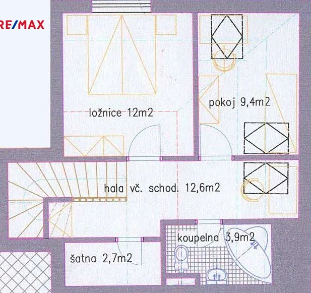 V patře najdete dvě ložnice s klimatizací, koupelnu s rohovou vanou, WC a praktickou šatnu.