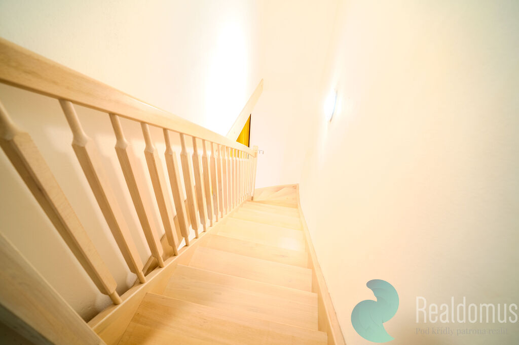V přízemí se nachází vstupní chodba se zádveřím, samostatné WC, technická místnost a světlý obývací pokoj s kuchyňským koutem a jídelnou, odkud je přímý vstup na venkovní terasu o velikosti 12 m² a do zahrady o rozloze cca 100 m². Zde najdete také bazén a zahradní domek, ideální pro uskladnění nářadí či jako letní zázemí.