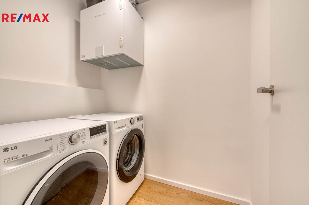 Kuchyňská linka na míru s vestavnými spotřebiči (varná deska, trouba, mikrovlnná trouba, digestoř, myčka, lednice s mrazákem). Dále je byt vybaven šatními skříněmi pračkou i sušičkou.