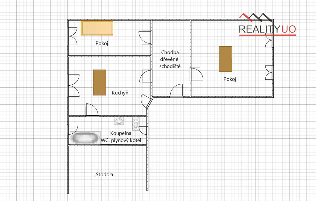 V přízemí domu se nachází kuchyně, dva pokoje, koupelna s vanou a WC, chodba se schodištěm do patra a vchod do sklepa.