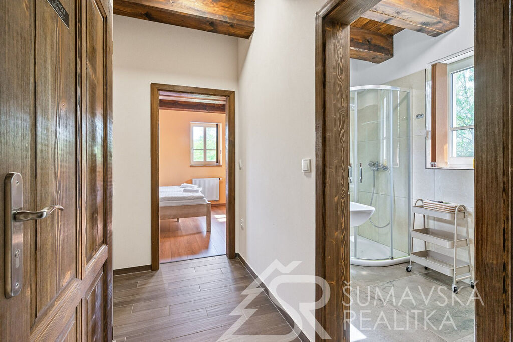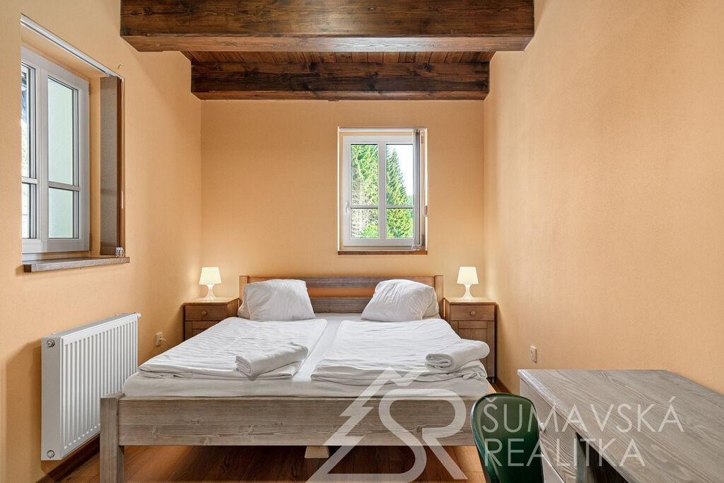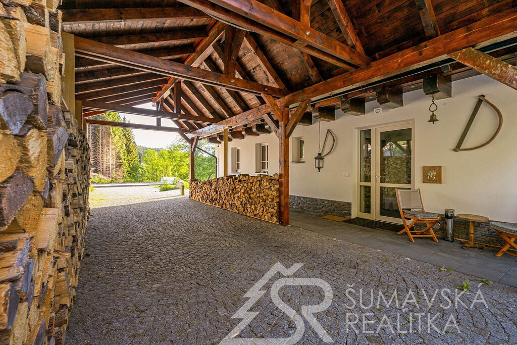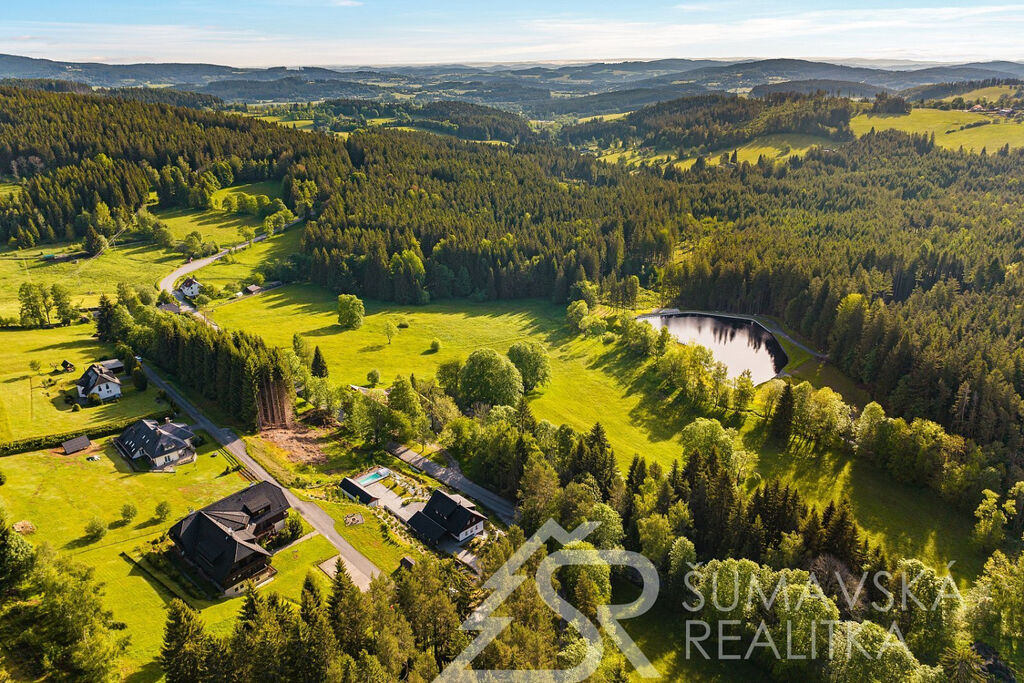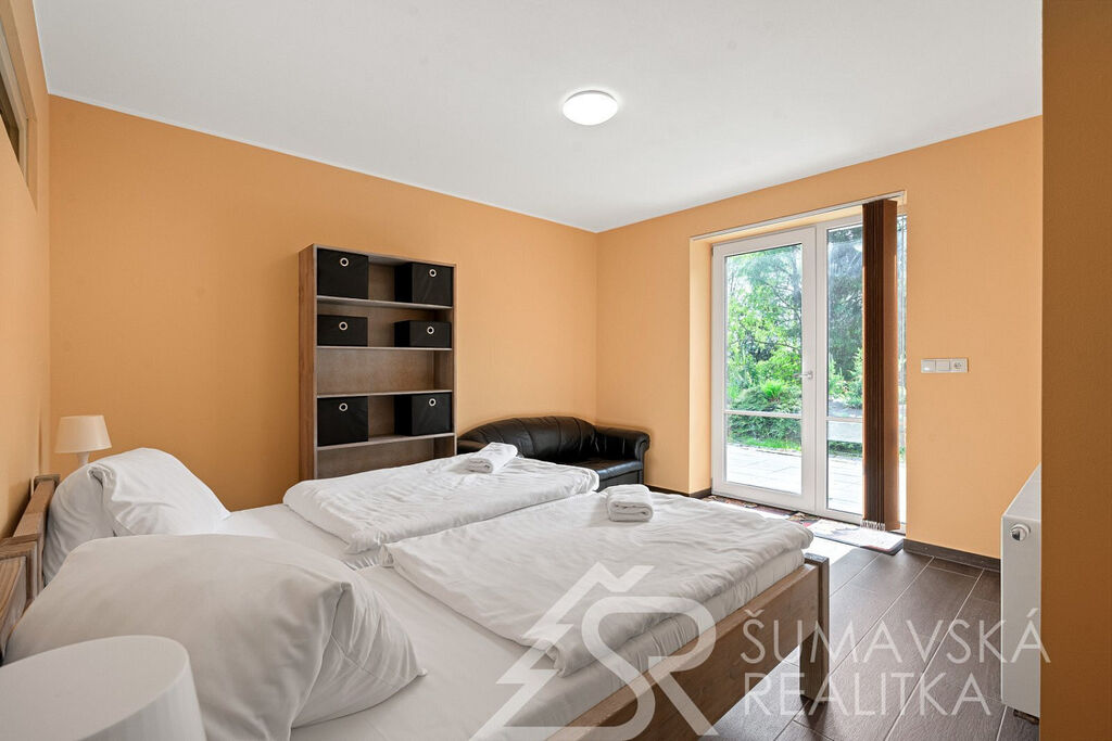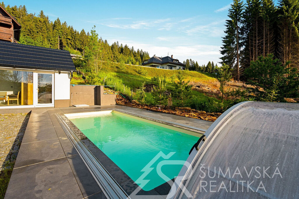 Popis domu: Nadstandardní stylový dům alpského typu, v němž se nachází tři samostatné luxusní bytové jednotky, je novostavbou na obdélníkovém půdorysu o velikosti 8,0 x 14,0 m. Usazen je v mírném svahu, na krásném, klidném – i v zimě dobře dostupném místě. Exteriér domu přiznává prvky původní šumavské architektury a má velmi příjemné barevné vyladění exteriéru – takže souzní s krajinou a působí přívětivě již při příjezdu. Součástí je i venkovní krytý a zastřešený bazén o rozměrech 8 x 3 x 1,2 m. Dále venkovní finská sauna s posezením v samostatném domku.