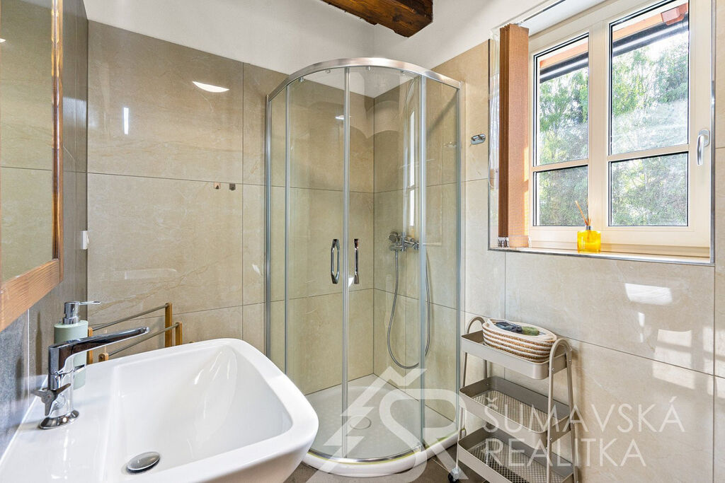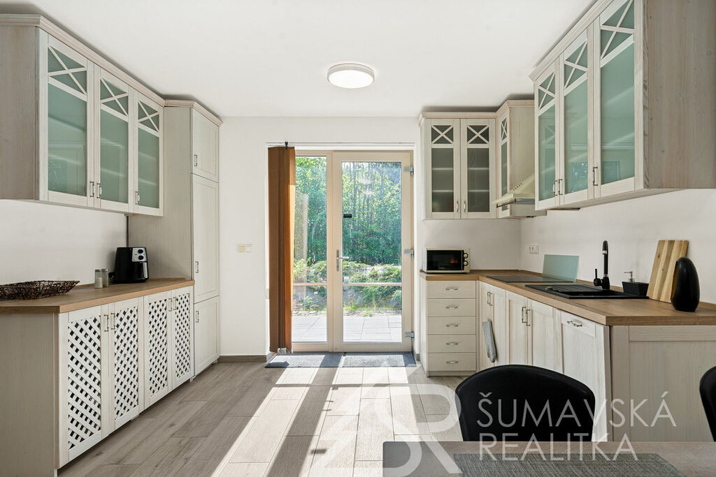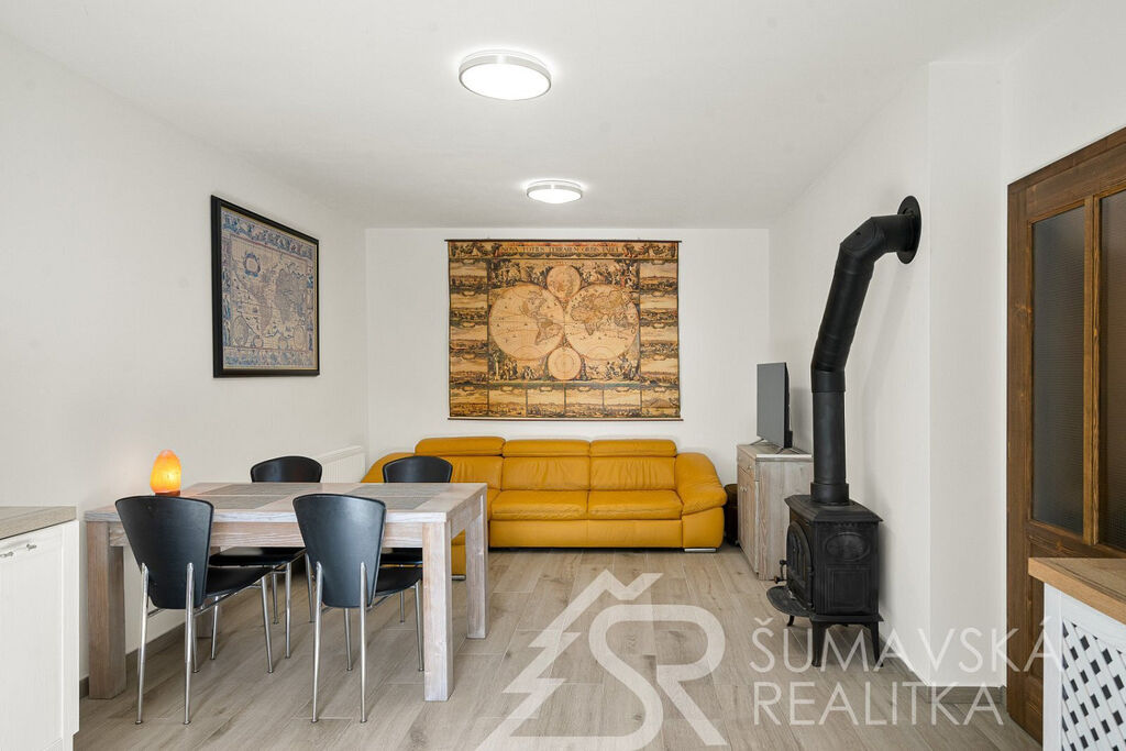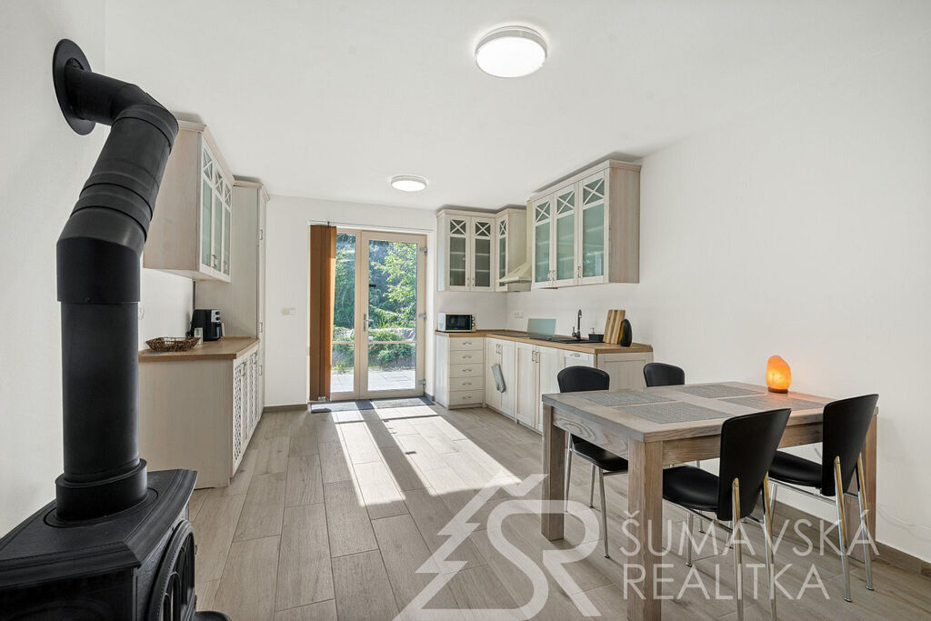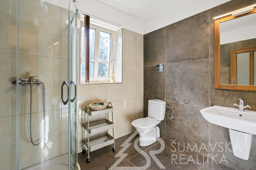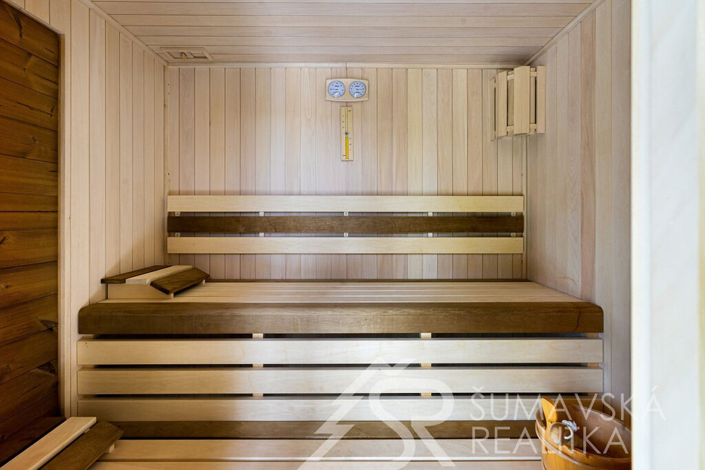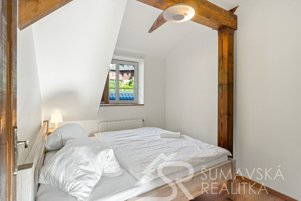 Popis domu: Nadstandardní stylový dům alpského typu, v němž se nachází tři samostatné luxusní bytové jednotky, je novostavbou na obdélníkovém půdorysu o velikosti 8,0 x 14,0 m. Usazen je v mírném svahu, na krásném, klidném – i v zimě dobře dostupném místě. Exteriér domu přiznává prvky původní šumavské architektury a má velmi příjemné barevné vyladění exteriéru – takže souzní s krajinou a působí přívětivě již při příjezdu. Součástí je i venkovní krytý a zastřešený bazén o rozměrech 8 x 3 x 1,2 m. Dále venkovní finská sauna s posezením v samostatném domku.