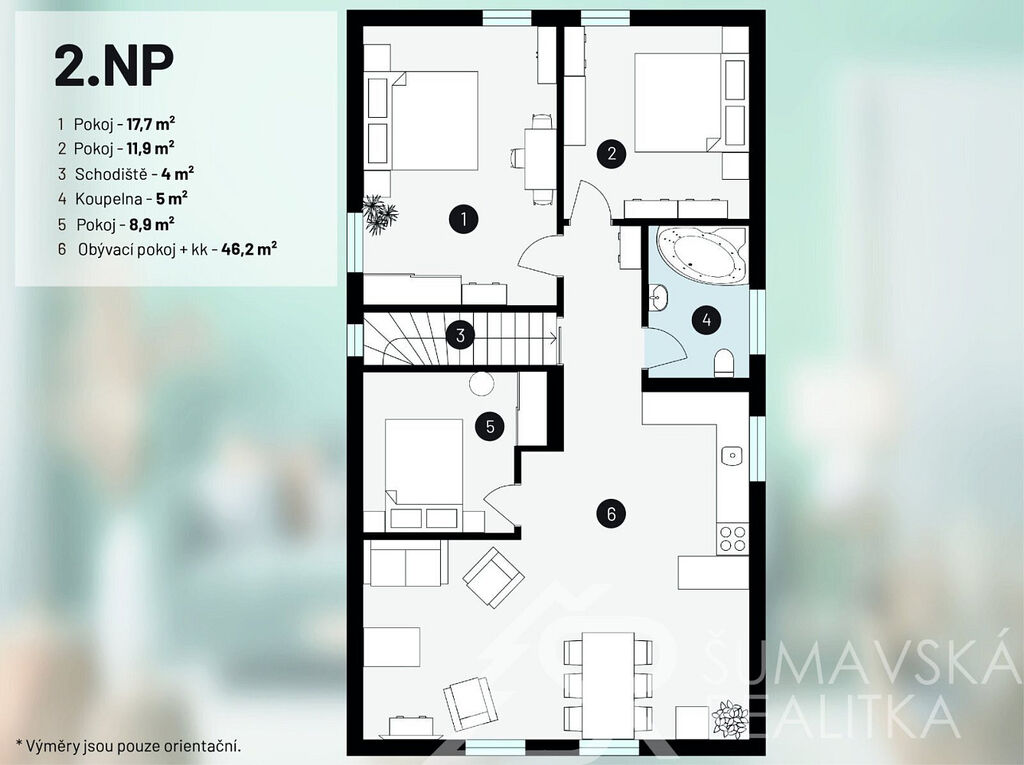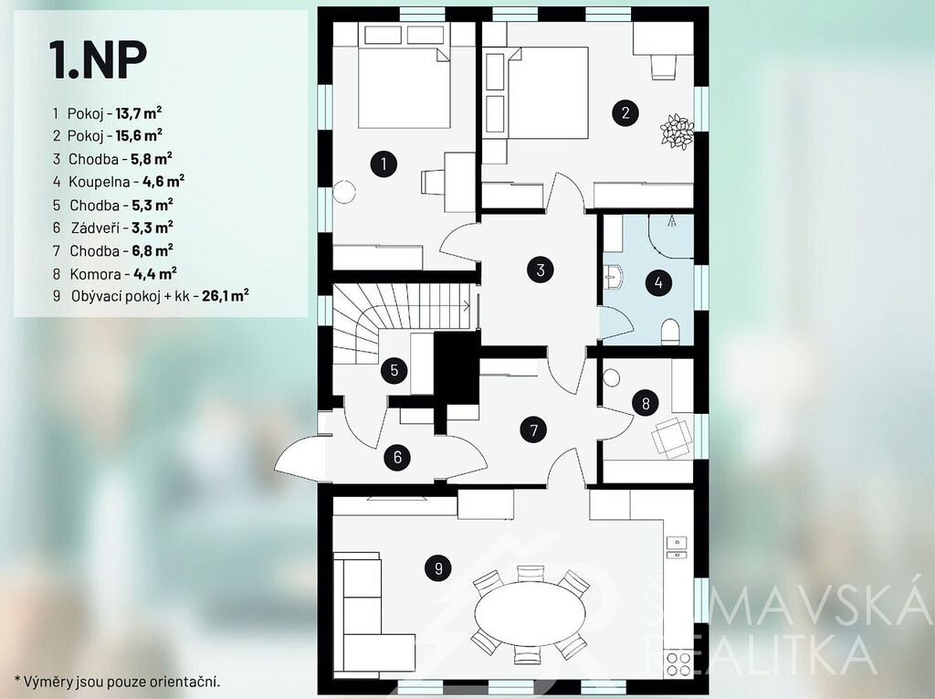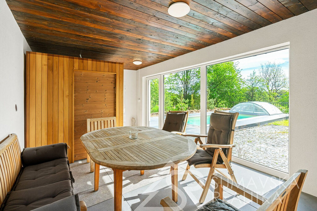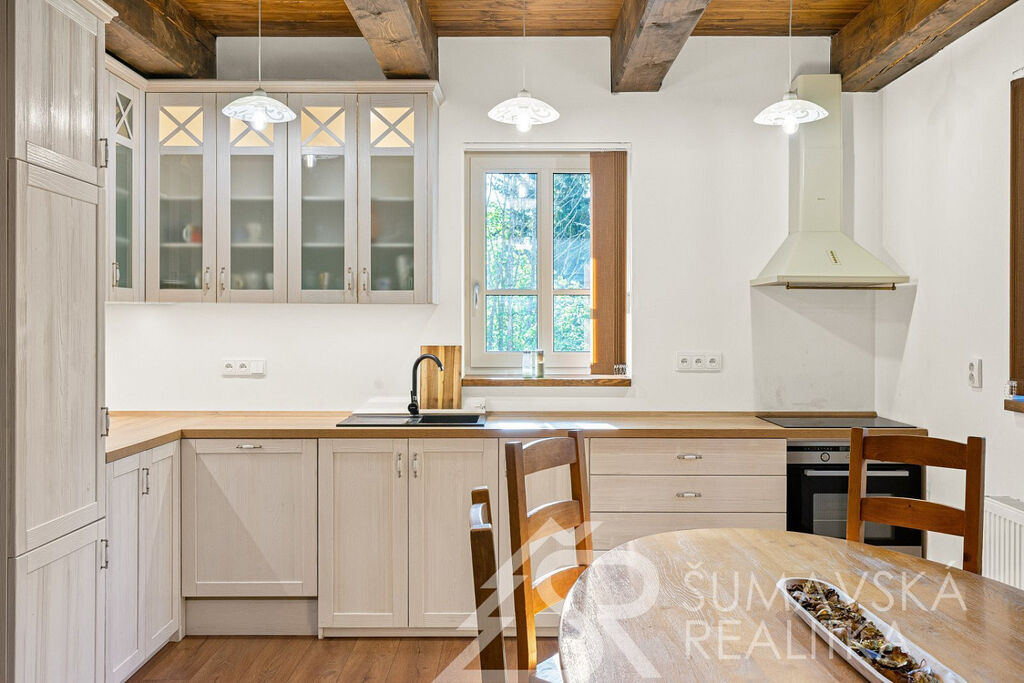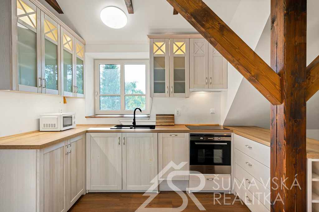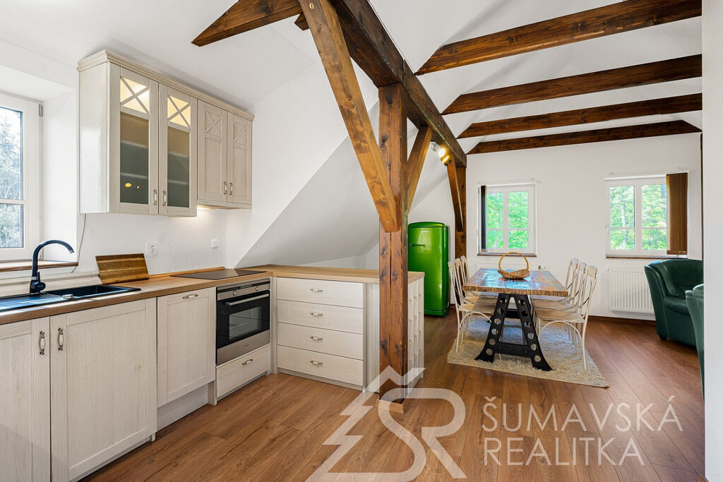 Popis domu: Nadstandardní stylový dům alpského typu, v němž se nachází tři samostatné luxusní bytové jednotky, je novostavbou na obdélníkovém půdorysu o velikosti 8,0 x 14,0 m. Usazen je v mírném svahu, na krásném, klidném – i v zimě dobře dostupném místě. Exteriér domu přiznává prvky původní šumavské architektury a má velmi příjemné barevné vyladění exteriéru – takže souzní s krajinou a působí přívětivě již při příjezdu. Součástí je i venkovní krytý a zastřešený bazén o rozměrech 8 x 3 x 1,2 m. Dále venkovní finská sauna s posezením v samostatném domku.