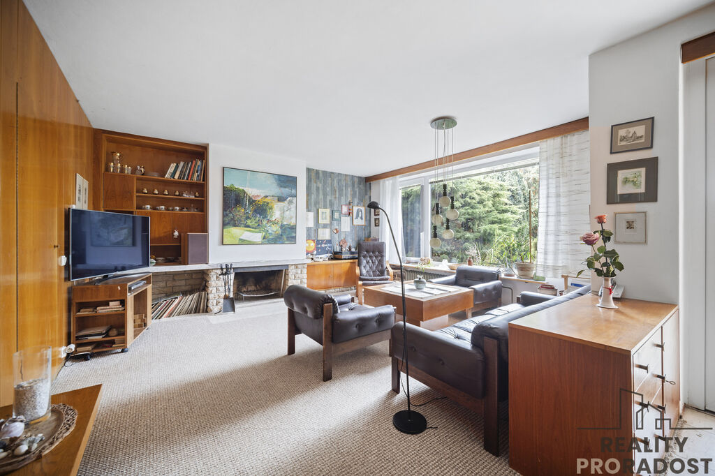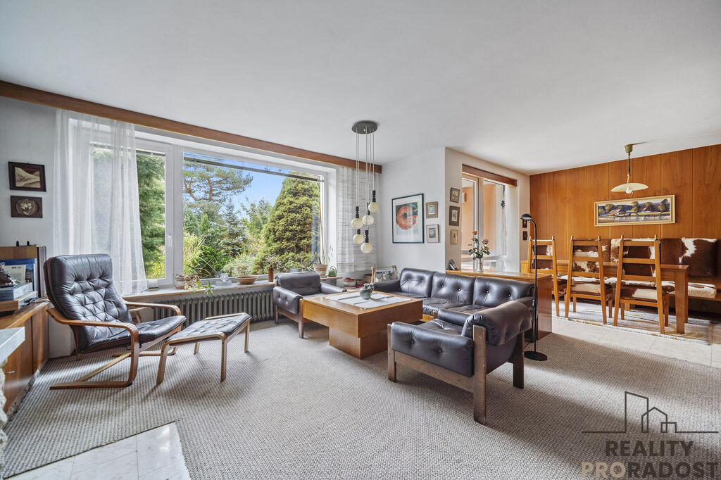 světlý obývací pokoj s dominantním proskleným oknem a výhledem do zahrady,