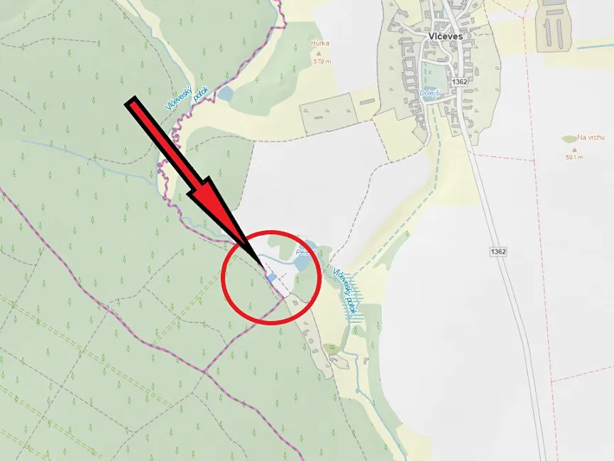 Pozemek se nachází na klidném okraji obce Vlčeves, v lokalitě s rozptýlenou zástavbou rodinných domů a rekreačních objektů.