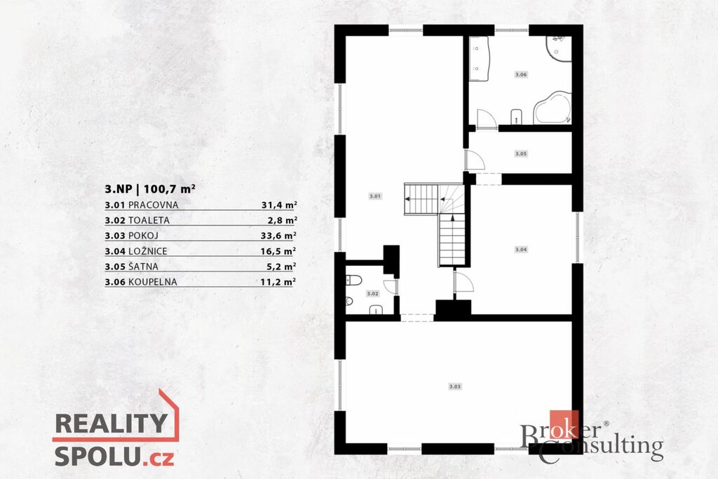3. NP: tři pokoje, prostorná koupelna a samostatné WC.