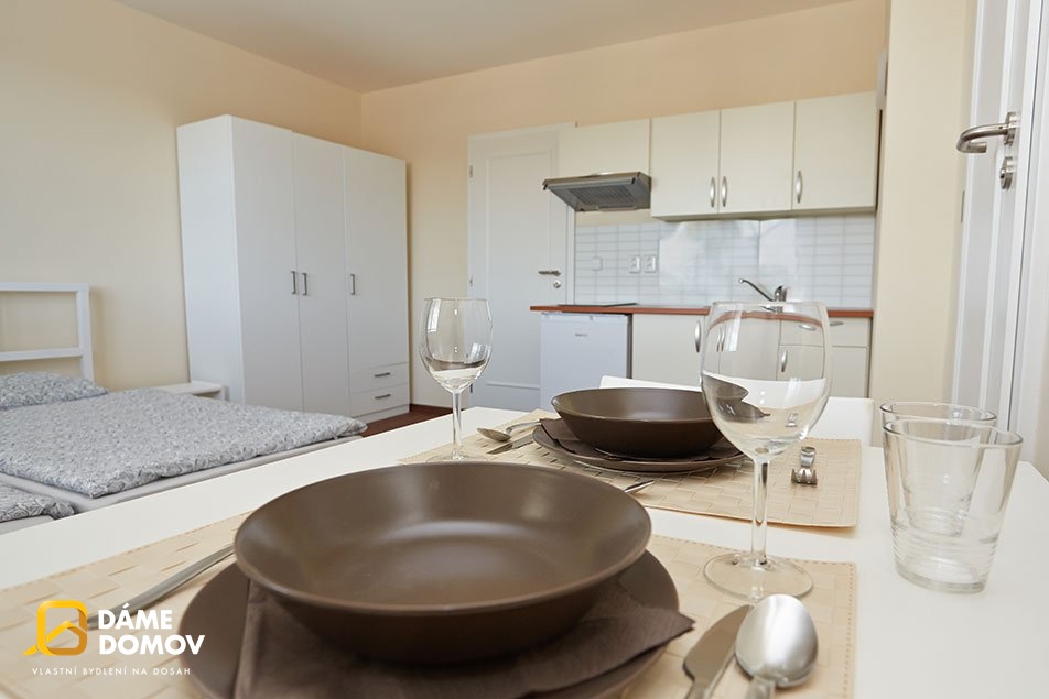 Byt se pronajímá zařízený, jak vidíte na fotografiích, včetně postele, skříně, stolu, kuchyňské linky s varnou deskou i lednicí (bez dekorací). Součástí bytu je rovněž koupelna se sprchovým koutem a WC. Parkování před domem na parkovišti nebo komunikaci. Za domem se nachází posezení a prádelna s kolárnou.