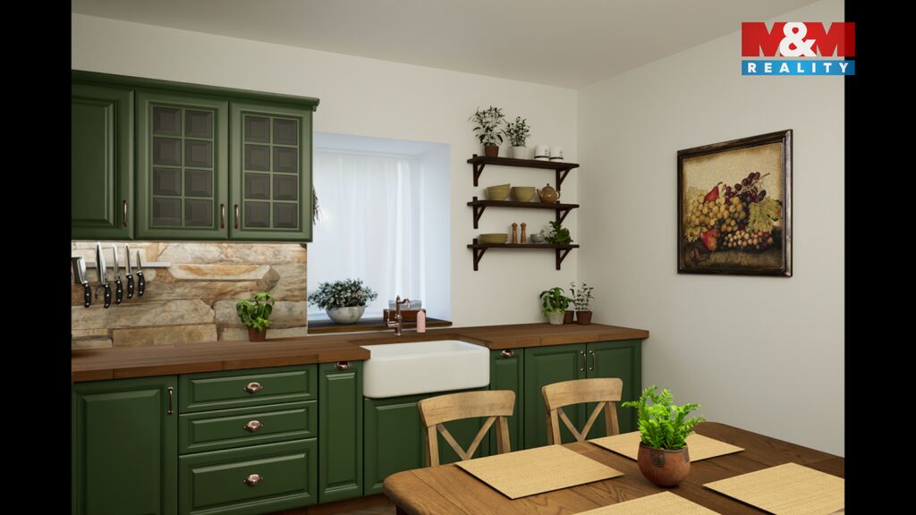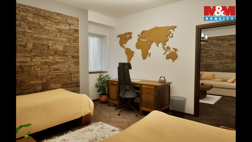 Tento byt se nachází v 1.NP rekonstruovaného domu, ve kterém je více bytů venkovského stylu. Byt má 65 m2 a je tu vstupní chodba, obývací pokoj s kuchyňským koutem, dvě ložnice, koupelna s vanou, umyvadlem a WC, dále pak komora. Orientace bytu je východ a západ. V bytě byly opraveny a ponechány původní opukové zdi, v obývacím pokoji jsou i dřevěné trámy, které umocňují venkovskou atmosféru bydlení.