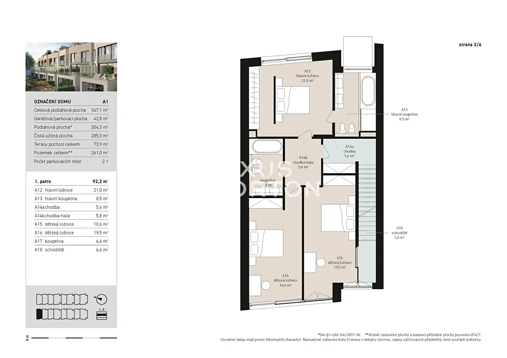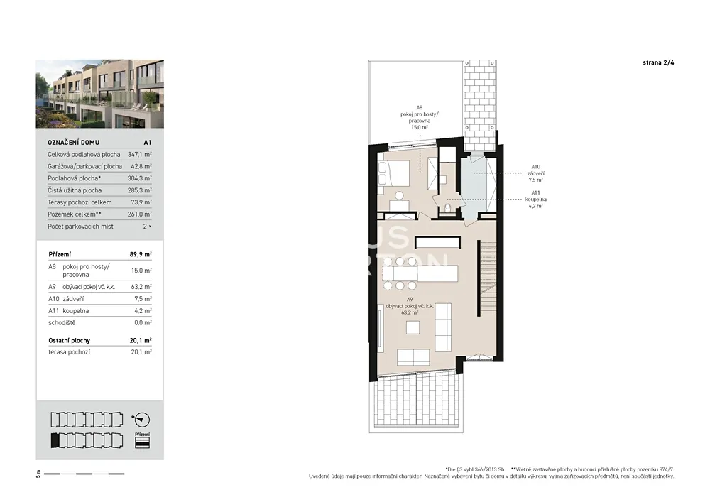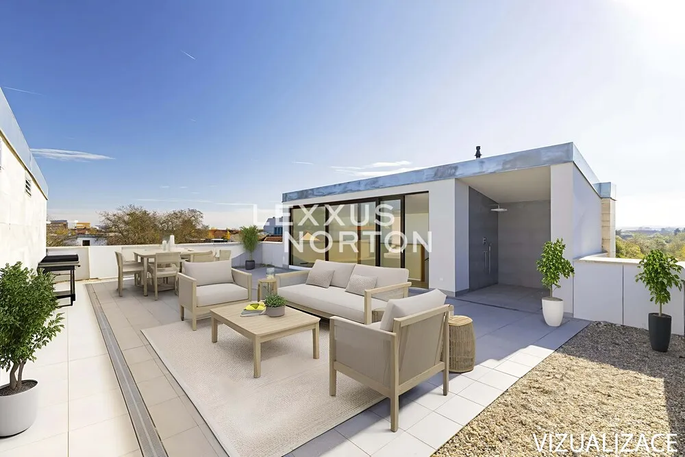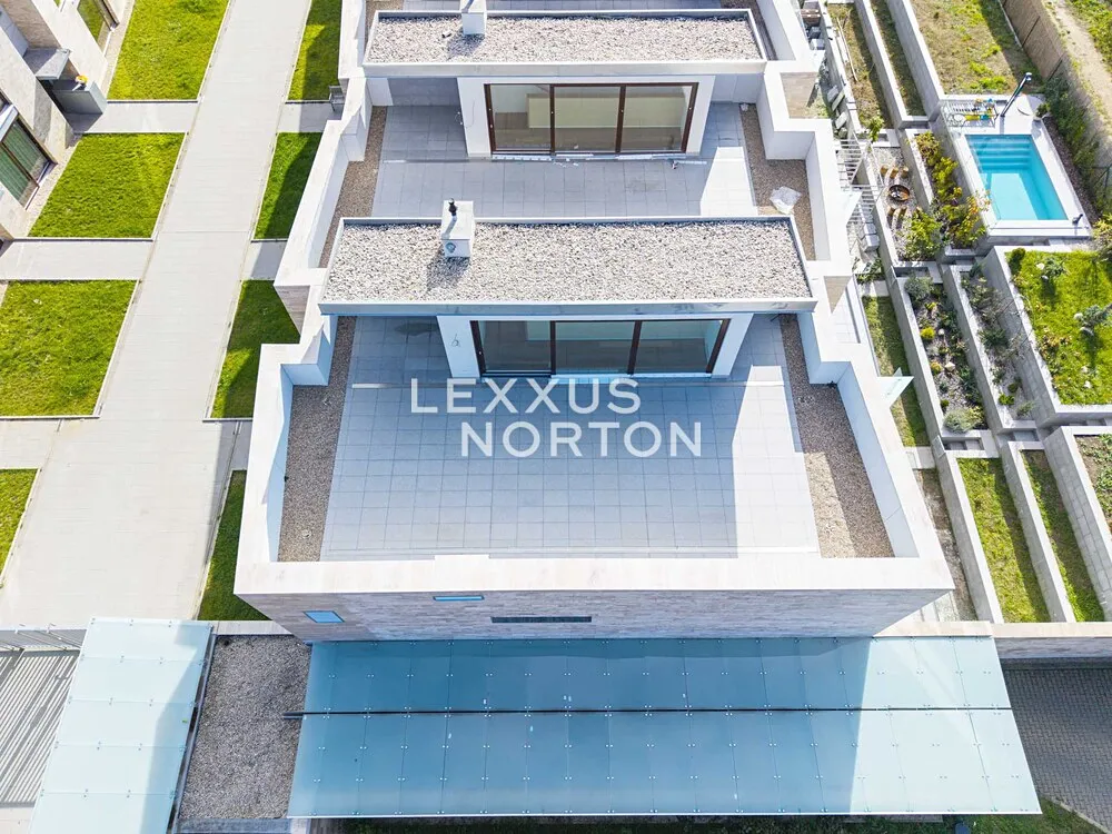K prodeji nabízíme výjimečnou rodinnou řadovou vilu 6+kk s celkovou podlahovou plochou 304 m² a dvěma parkovacími stáními v podzemních garážích. Tento promyšleně navržený dům je ideální pro rodiny hledající maximální komfort a flexibilitu prostoru. Přízemí domu nabízí velkorysý obývací prostor s přípravou pro kuchyňský kout (63 m²) s přímým výstupem na terasu s výhledem do zeleně přilehlého lesoparku. V přízemí je dále k dispozici pokoj pro hosty s vlastní koupelnou a toaletou, který může sloužit také jako pracovna. První patro disponuje hlavní ložnicí 21 m² s vlastní koupelnou a šatnou, 2 prostornými ložnicemi (18,5 m², 19,5 m²) a další samostatnou koupelnou se sprchou a vanou. Korunou domu je krásná střešní terasa 74 m² s výhledy do okolní zástavby a zeleně, kterou lze při zastřešení využívat téměř celoročně.
