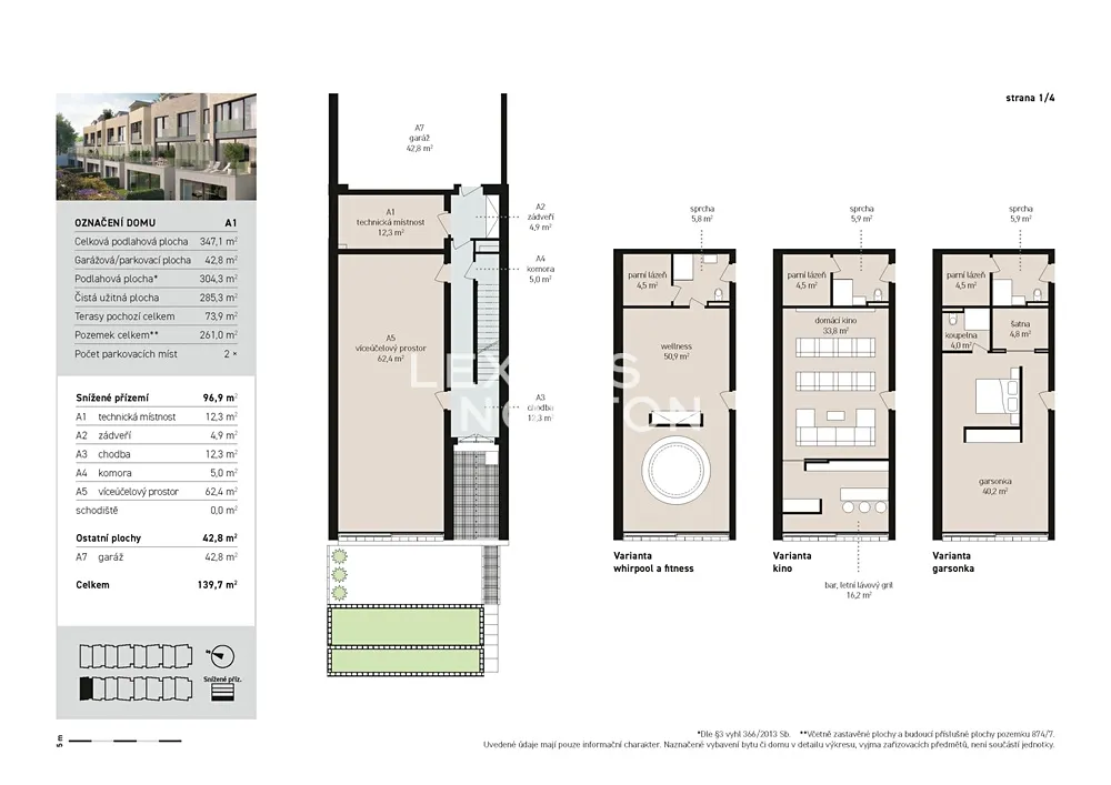 Snížené přízemí domu nabízí technické zázemí, a především prostornou víceúčelovou místnost o rozloze 63,4 m² s výstupem na terasu a kaskádovitou zahradu o rozloze 98 m², která může sloužit jako samostatná bytová jednotka až 2+kk, díky které je dům vhodný i jako dvougenerační bydlení. Místnost lze také využít jako domácí kino, pracovnu, fitness či wellness zónu.