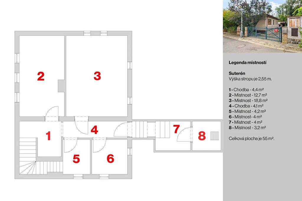 Dům je podsklepen téměř v celé ploše, s dvěma většími místnostmi 18m² + 13m² a dvě menší cca 4m² + 4,5m², v celém 1.PP je výška stropů 255cm.