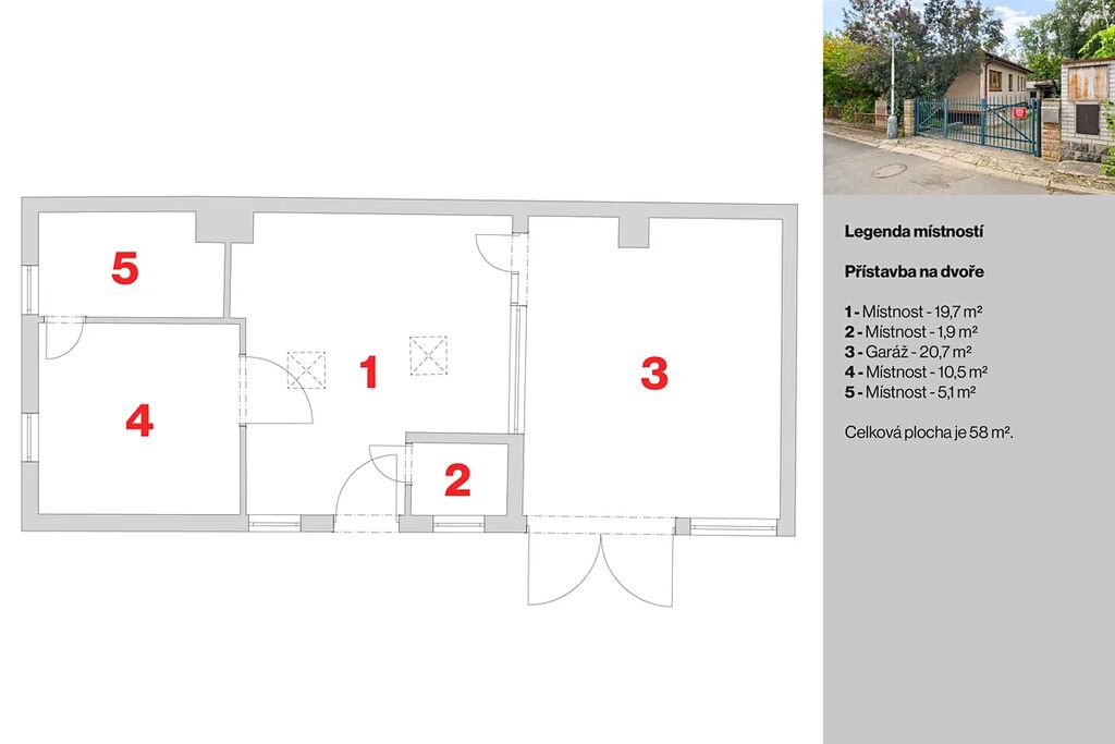Rozlehlý pozemek a umístění domu s přístavbou na pozemku dává možnost dalšího využití, přestavby domu.