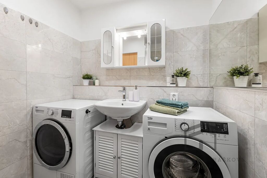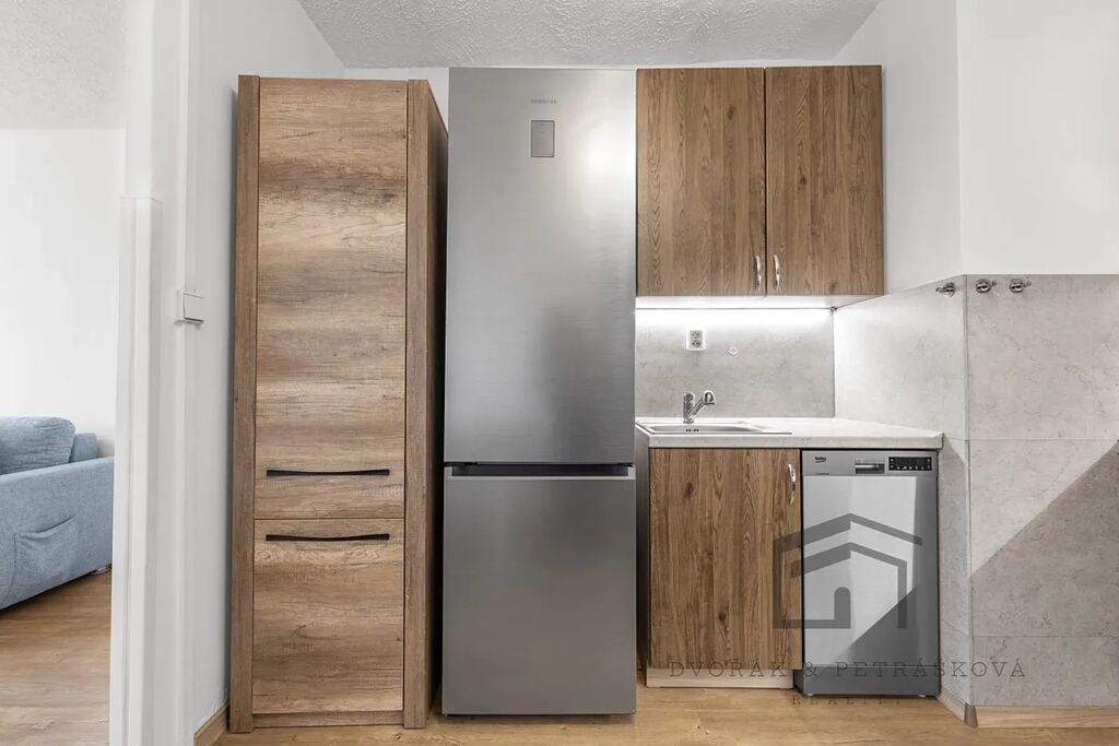 Na prostorný a světlý obývací pokoj navazuje plně vybavená kuchyňská linka, kde naleznete vše co potřebujete včetně plynové varné desky s digestoří, el. horkovzdušnou troubu, mikrovlnnou troubu, myčku na nádobí a nerezový dřez se sprchovou baterií.