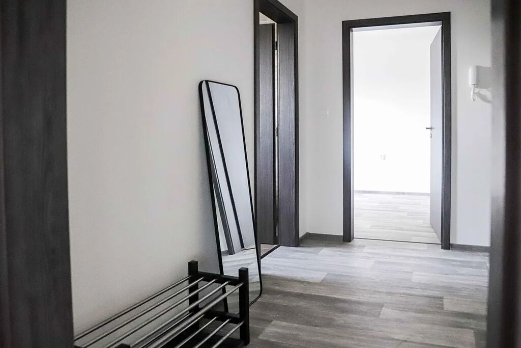Součástí vybavení je i prostorná skříň s botníkem a zrcadlem.