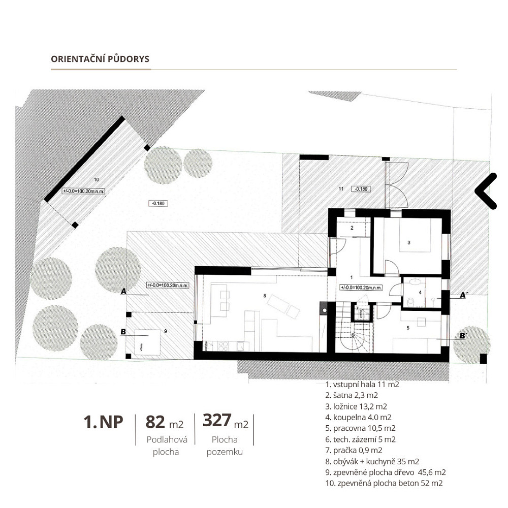 Z pozemku o celkové rozloze 327 m² byla demoličním výměrem odstraněna stará nemovitost a navržen nový, dispozičně velmi dobře řešený RD 5+kk s maximálním využitím daného prostoru.