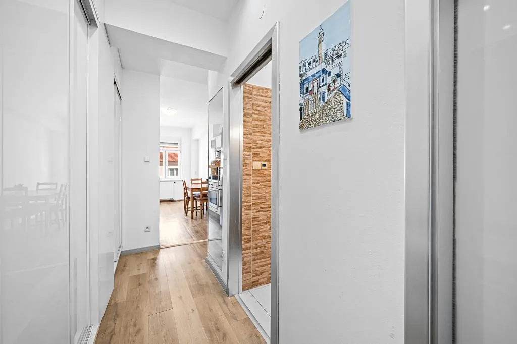 Skládá se ze 2 prostorných a neprůchozích pokojů z toho jeden má balkon, příjemné kuchyně, velké koupelny se sprch. koutem, samostatného WC a předsíně do L s velkými skříněmi.