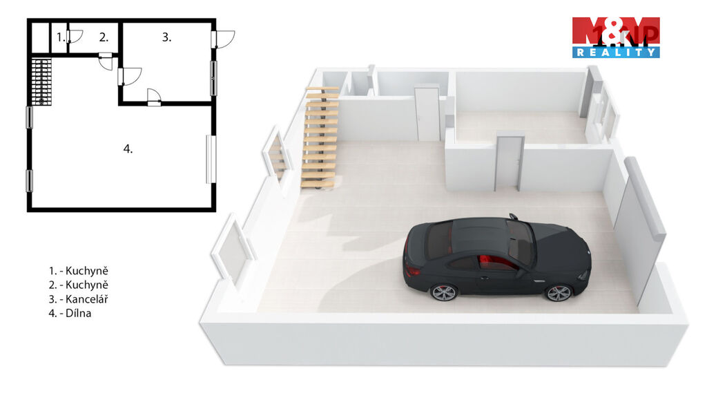 Nad prostory dílny se nachází obytná místnost a další dvě jsou v přízemí se sociálním zázemím a kuchyňkou. Objekt disponuje zastřešenou terasou.