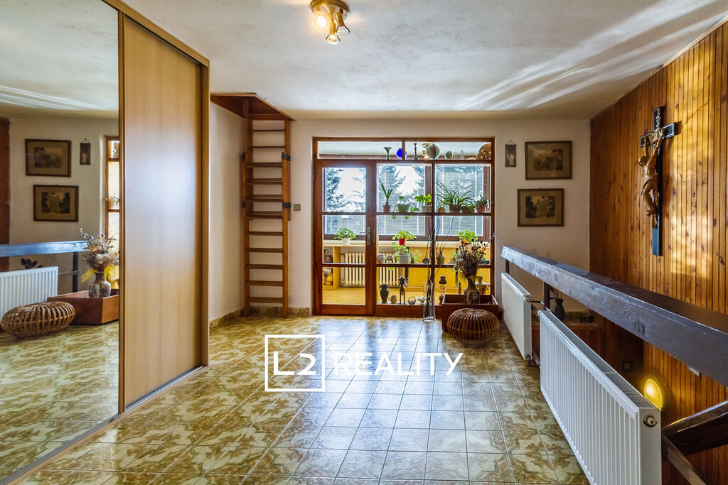 Součástí nemovitosti je také samostatný byt 1+kk o ploše přibližně 30 m², přístupný ze vstupní haly. Tento byt zahrnuje obývací pokoj s kuchyňským koutem, mezonetový prostor na spaní a koupelnu se sprchovým koutem a toaletou.