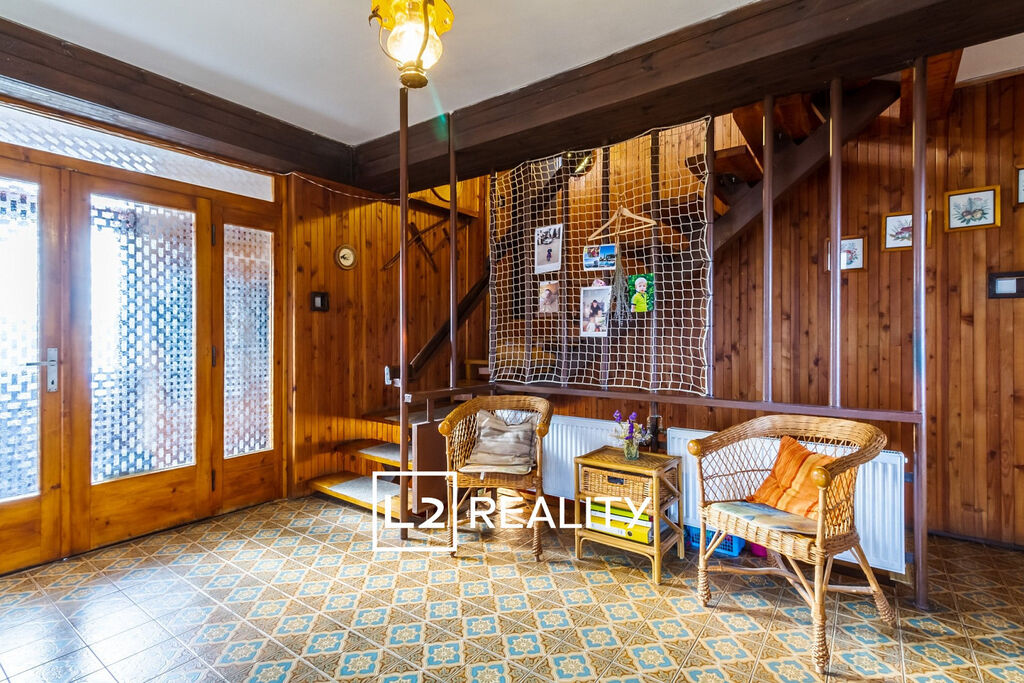 Hlavním prostorem domu je 45 m² velký obývací pokoj s krbem, jídelnou a přímým vstupem na terasu. Kuchyň je plně vybavená a umožňuje vstup do zahrady. V přízemí se dále nachází vstupní hala, samostatná toaleta a zádveří. V patře je prostorná a světlá ložnice se vstupem na balkon, dva dětské pokoje, velká koupelna s vanou a dvěma umyvadly, samostatná toaleta, prostorná hala a zimní zahrada. Dům je celý podsklepený a nabízí technické zázemí i velký skladovací prostor. Je napojen na elektřinu, městský vodovod, splaškovou kanalizaci a plynovod.
