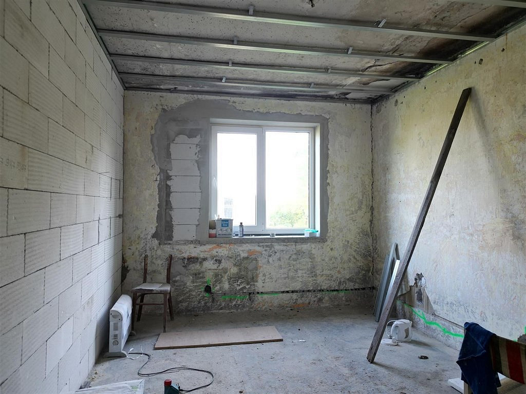 Nová plastová okna s trojskly, vyzděné vnitřní příčky a připravené rastry pro sádrokartonové podhledy