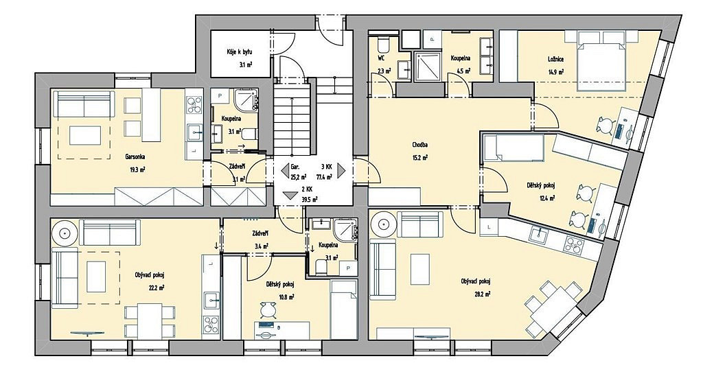 Součástí nabídky je studie sedmi bytů v 1. a 2. nadzemním podlaží, která maximálně respektuje stávající polohu nosných stěn a oken.
